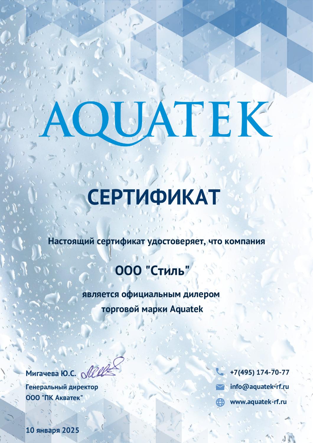 Сертификат официального дилера торговой марки Aquatek