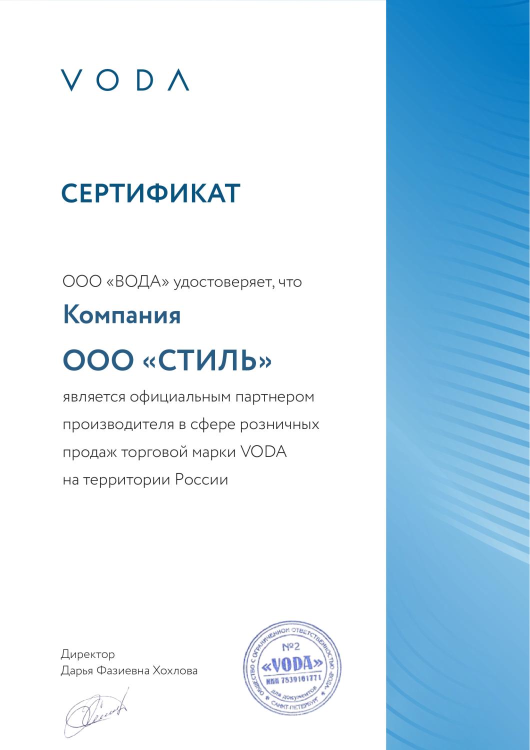 Сертификат официального дистрибьютора от бренда VODA