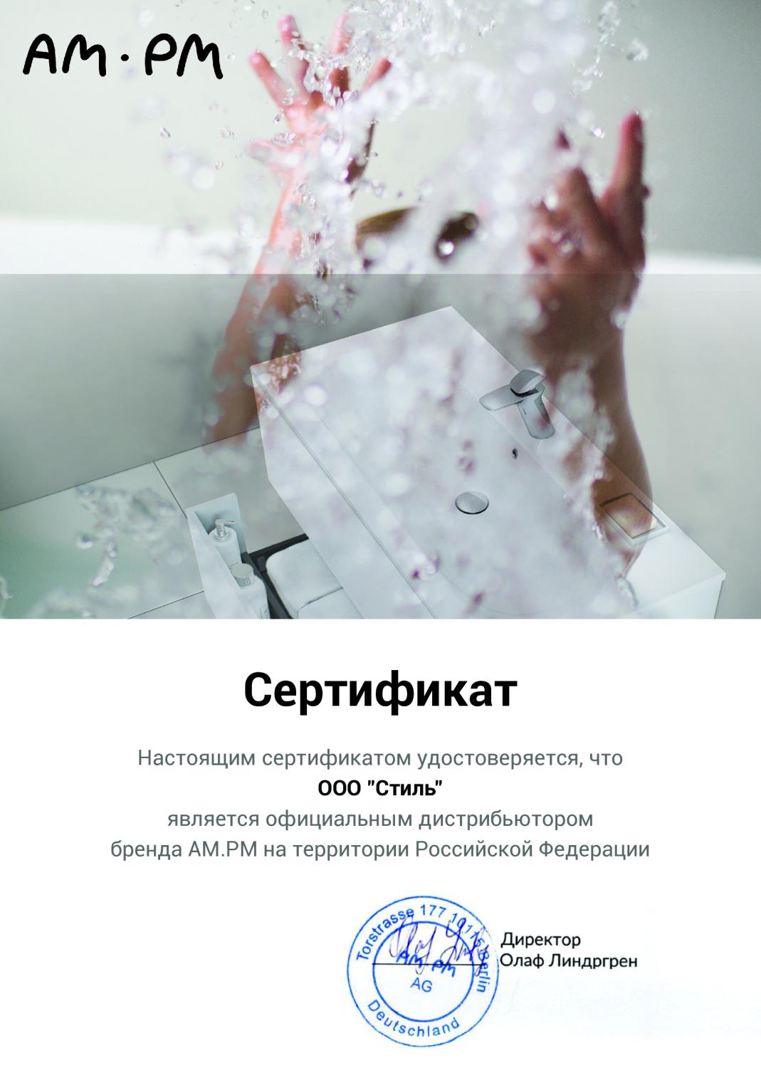 Сертификат официального дистрибьютора от бренда AM.PM